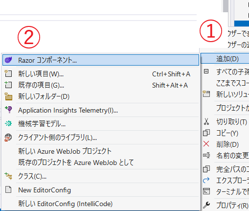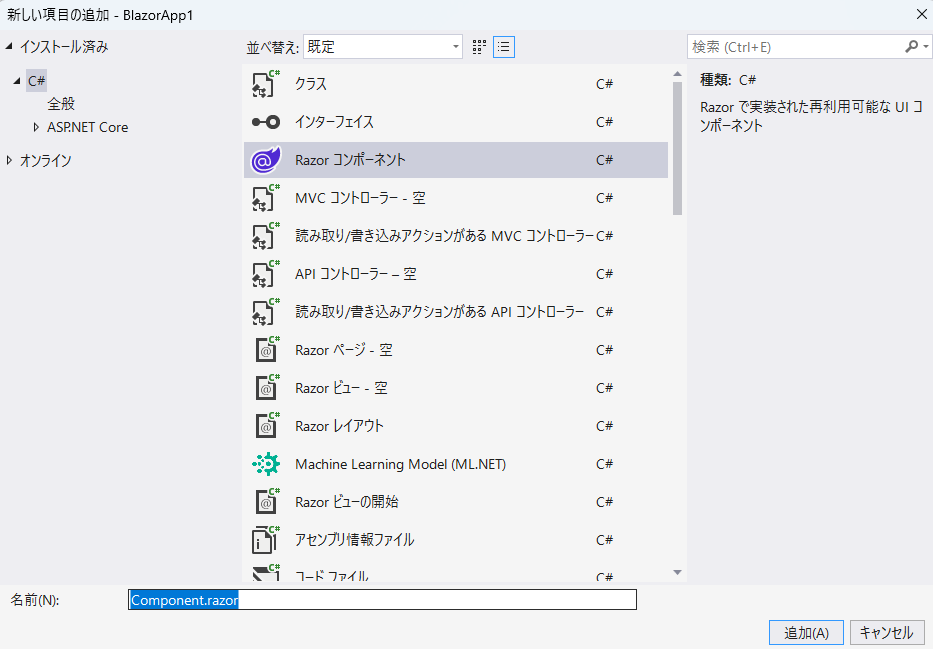 「追加」→「Razorコンポーネント...」をクリックすると、モーダルウィンドウが表示されます。