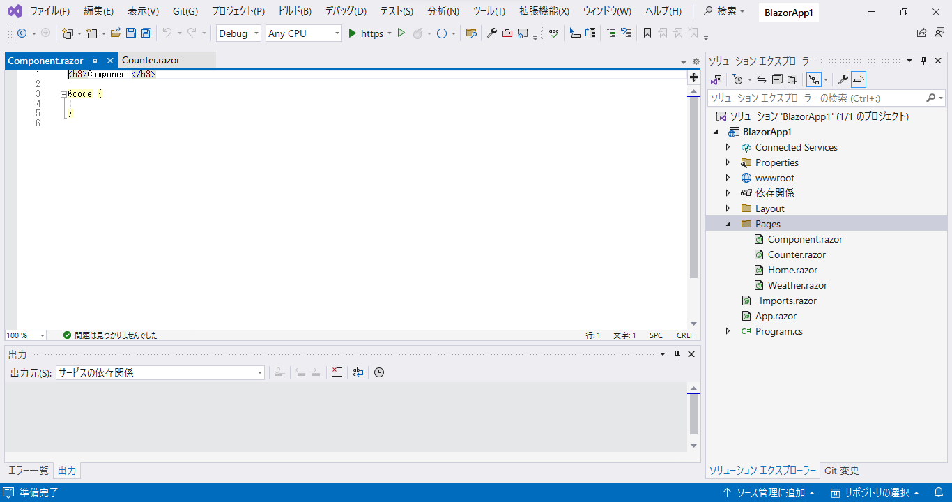例えば、プロジェクトの作成と同時に作られるHome.razor、Counter.razor、Weather.razorのうちの、Counter.razorは下のようなソースコードで構成されます